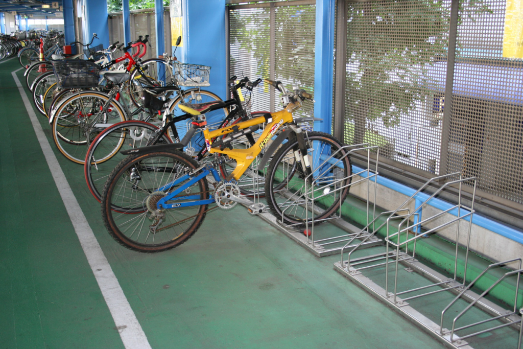 デフォルトで付属しているキックスタンドも街乗りとしては優秀なのですが、私は住む地域の駐輪場は一台ごとに区画があるわけではなく(画像のようなやつ)、他の方の自転車と横並び詰め詰めで駐輪するしかないんです。